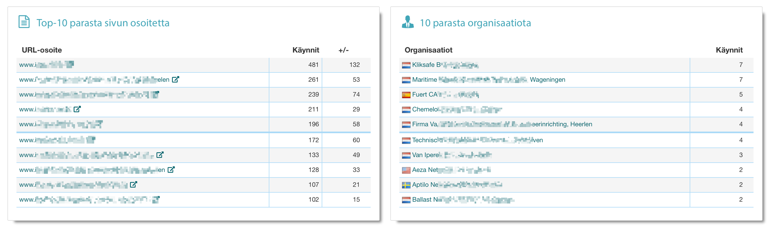 Yleisen Analytiikan Dashboardissa kaksi alinta elementtiä näyttävät 10 suosituinta sivua ja niiden organisaatioiden nimet, jotka ovat eniten käyneet sivustollasi 7 tai 30 päivän aikana.