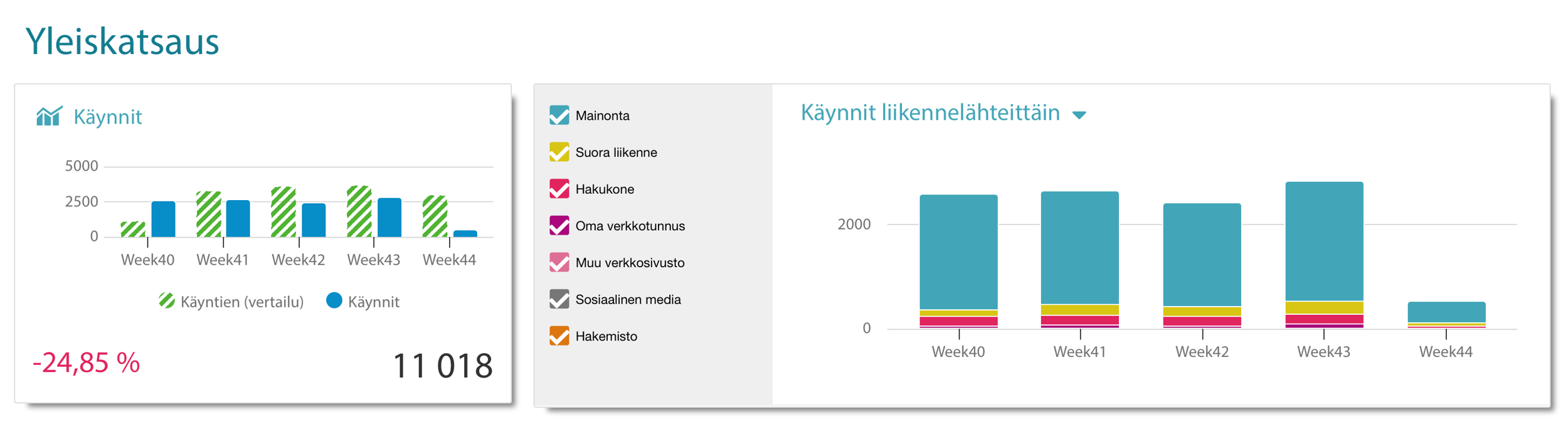 Kaksi ensimmäistä elementtiä osoittavat 7 tai 30-päivän käynnit verrattuna edelliseen jaksoon sekä liikenteen lähteen – miten kävijä saapui verkkosivustollesi. Voit klikata viikkoa tai päivää zoomataksesi kyseiseen ajanjaksoon.