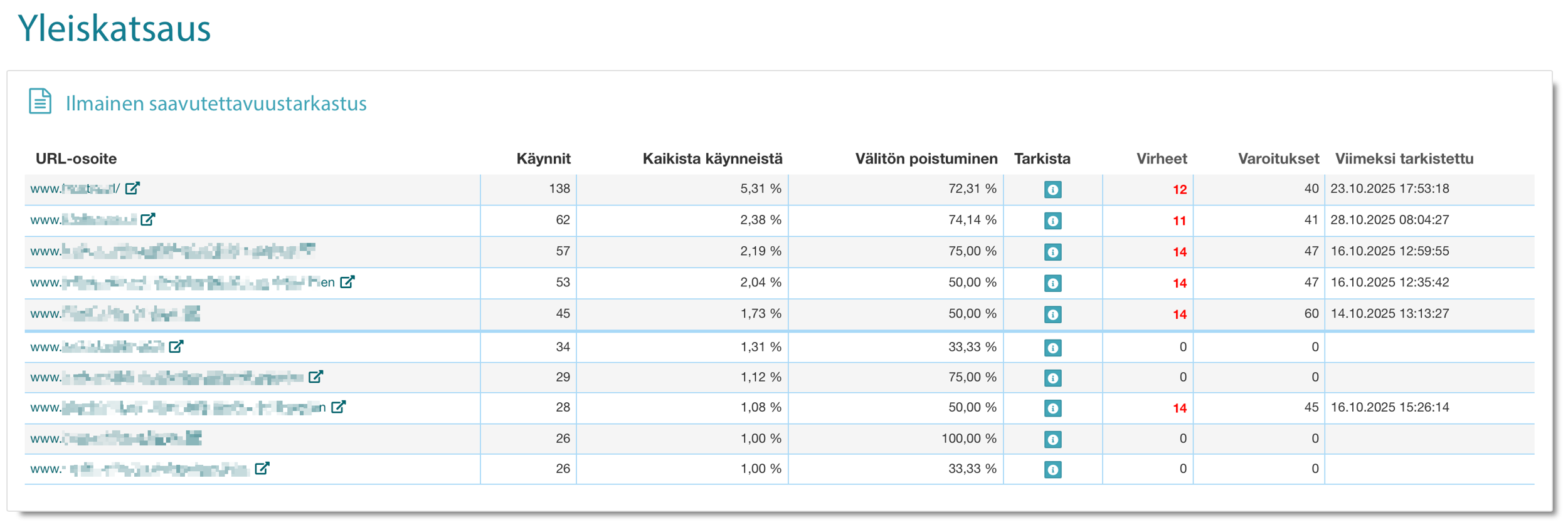 Saavutettavuuden tarkistuspaneelin avulla voit tarkistaa 10 tärkeimmän sivun saavutettavuuden WCAG-normien mukaisesti sekä tarkastella lisätietoja näistä sivuista. Tarkistettujen sivujen tiedot voidaan tulostaa tai jakaa myöhempää seurantaa varten verkkosivustosi asiantuntijoille.