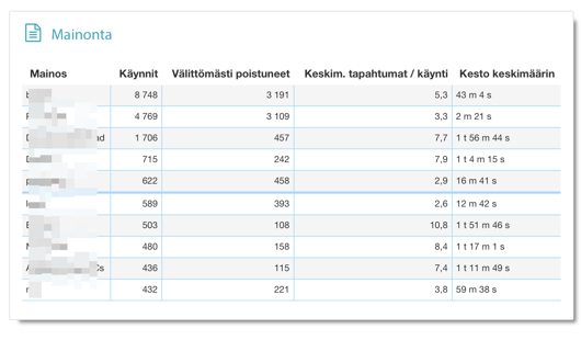 Mainonnan Analytiikan Dashboardissa vasemmassa alakulmassa näkyvät vierailijoitten käyttämät mainokset.